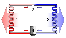 Princip tepelného čerpadla:1. kondenzátor 2. tryska 3. výparník 4. kompresor